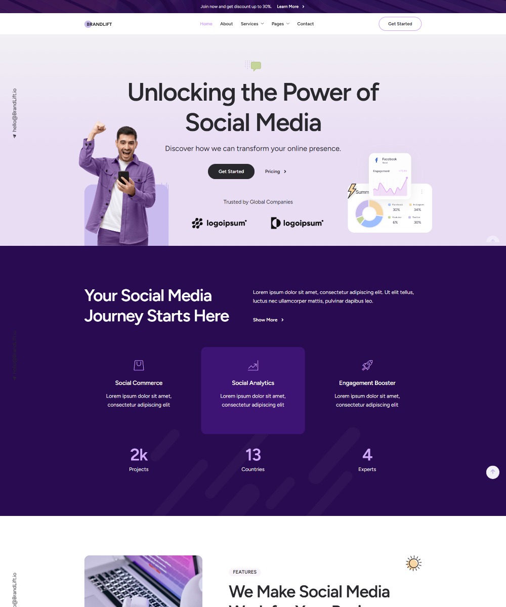 Built with Elementor, BrandLift is a flexible and modern social media marketing agency Elementor template designed to showcase your services and results with style. It features clean layouts, intuitive navigation, and customizable sections to highlight your expertise in social strategy, content creation, and client success. Perfect for agencies looking to attract new clients and grow online, this template ensures your brand stands out and converts visitors into leads.