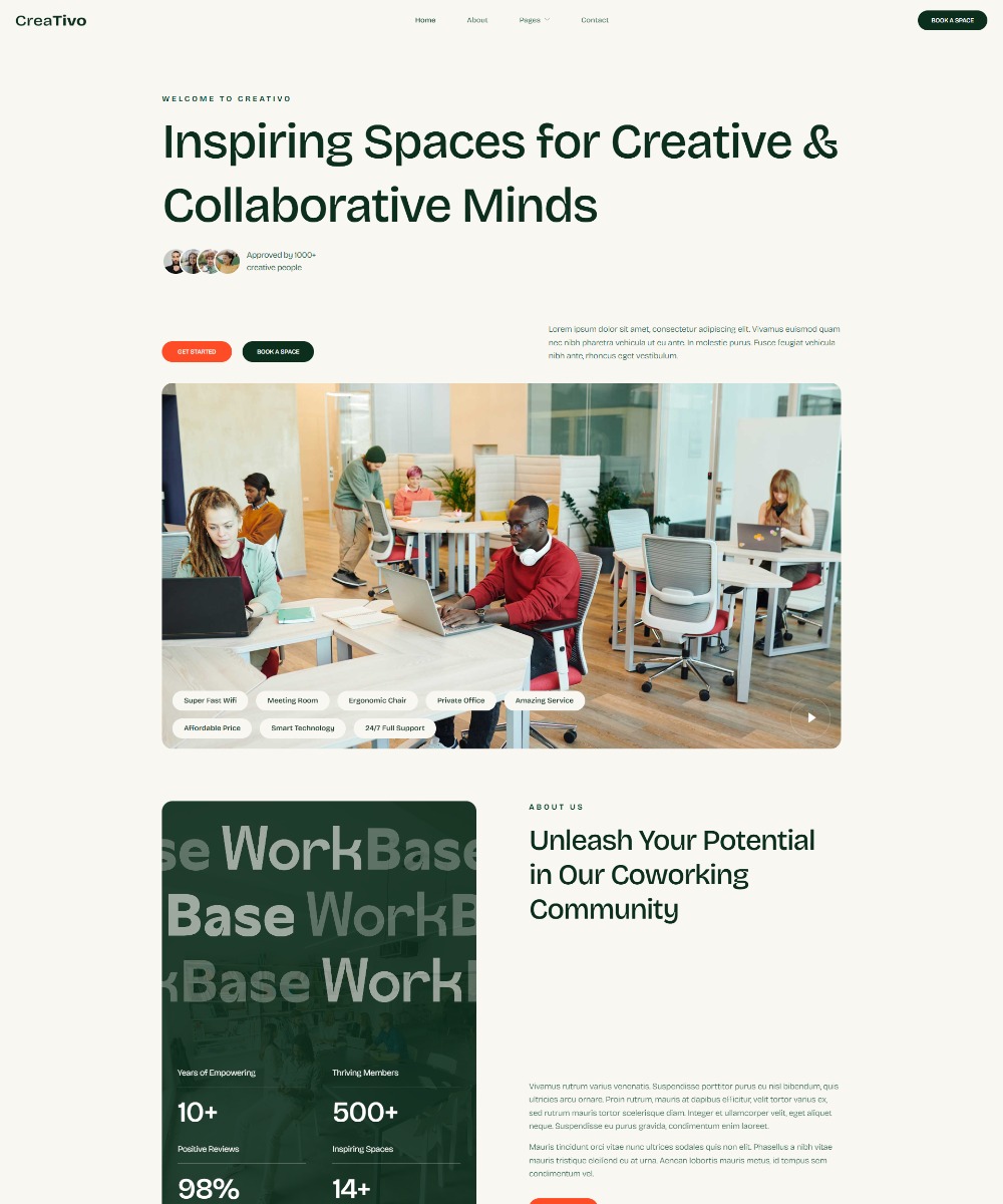 Whether you’re promoting a coworking hub, creative studio, or collaborative community space, Creativo makes it simple to create a standout online presence without coding. Built with Elementor, the drag-and-drop functionality lets you tailor every page to your brand’s style and goals. From homepage to contact page, this template is SEO friendly, easy to edit, and perfect for driving bookings, inquiries, and membership sign-ups.