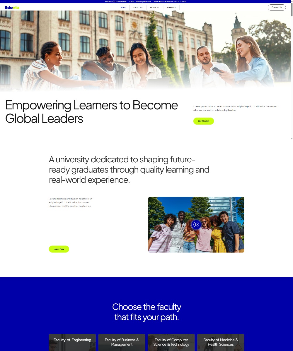 Edovia is a modern and versatile Elementor template built with Elementor for university and school education websites. It offers clean, professional layouts designed to showcase academic programs, faculty, events, and campus life. With intuitive navigation and customizable sections, Edovia helps educational institutions create a polished online presence that attracts students and boosts engagement.