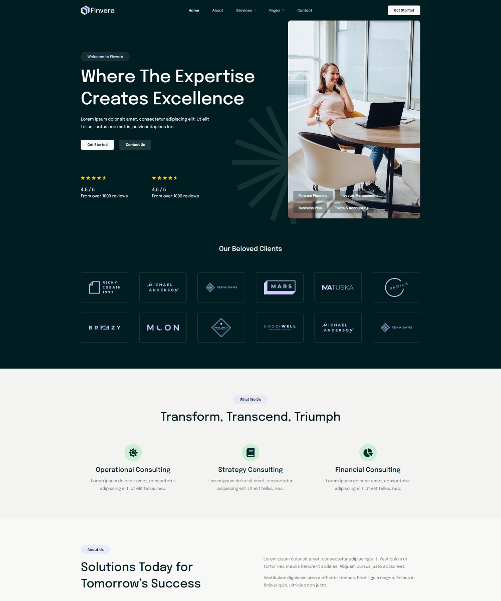 Finvera is a professional Business and Finance Consulting Elementor template built with Elementor to help you create a high-impact consulting website with ease. This clean and modern design is ideal for finance firms, advisors, accountants, and business consultants who want to showcase their services and expertise. With fully customizable sections, you can easily highlight your services, client testimonials, team members, and case studies to build trust and drive conversions. Every layout is crafted with user experience and responsiveness in mind to ensure your site looks great on all devices and loads fast.