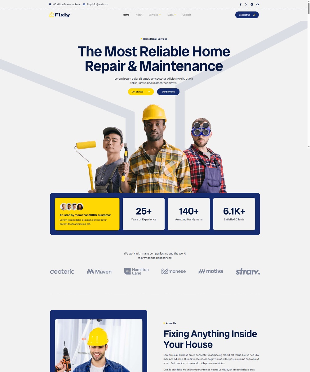 Fixly is a clean and professional Elementor template built with Elementor for home repair and maintenance services. Designed to help your business stand out online, it offers ready-to-use sections for services, team, testimonials, and contact. With responsive layouts and easy customization, Fixly lets you showcase your repair expertise and attract more local customers.