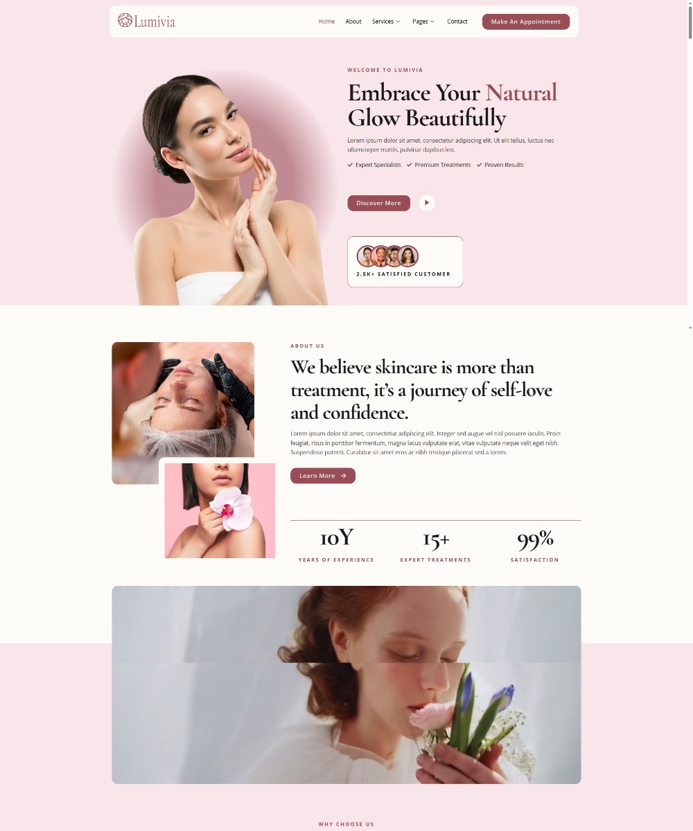 Lumivia is a beautifully designed skincare and dermatology Elementor template crafted to showcase your beauty, wellness, and skin treatment services with style and clarity. Built with Elementor, this template offers clean layouts, easy customization, and a professional look that helps your clinic stand out online. With sections for treatments, expert teams, testimonials, and feature highlights, Lumivia makes it simple to connect with new clients and share your expertise in skincare and dermatology.