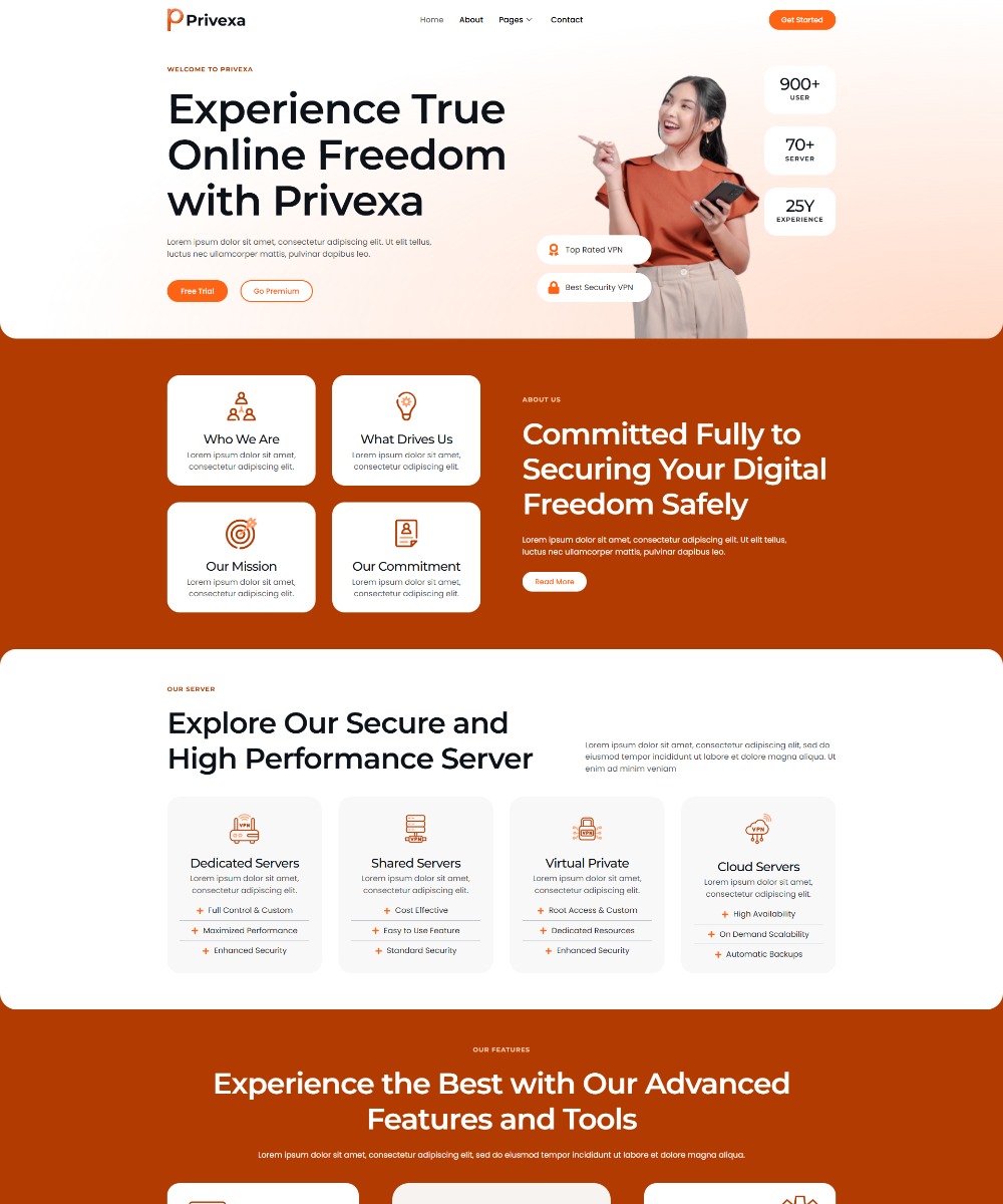 Privexa is a clean and modern Elementor template built for VPN service and proxy security websites. Designed with Elementor, this template offers easy customization, fast performance, and a professional layout that helps you showcase your VPN features, security plans, and global server locations. With built-in sections for pricing, testimonials, FAQs, and call-to-action, Privexa helps you convert visitors into users with confidence. The responsive design makes your site look great on all devices, improving engagement and user experience.
