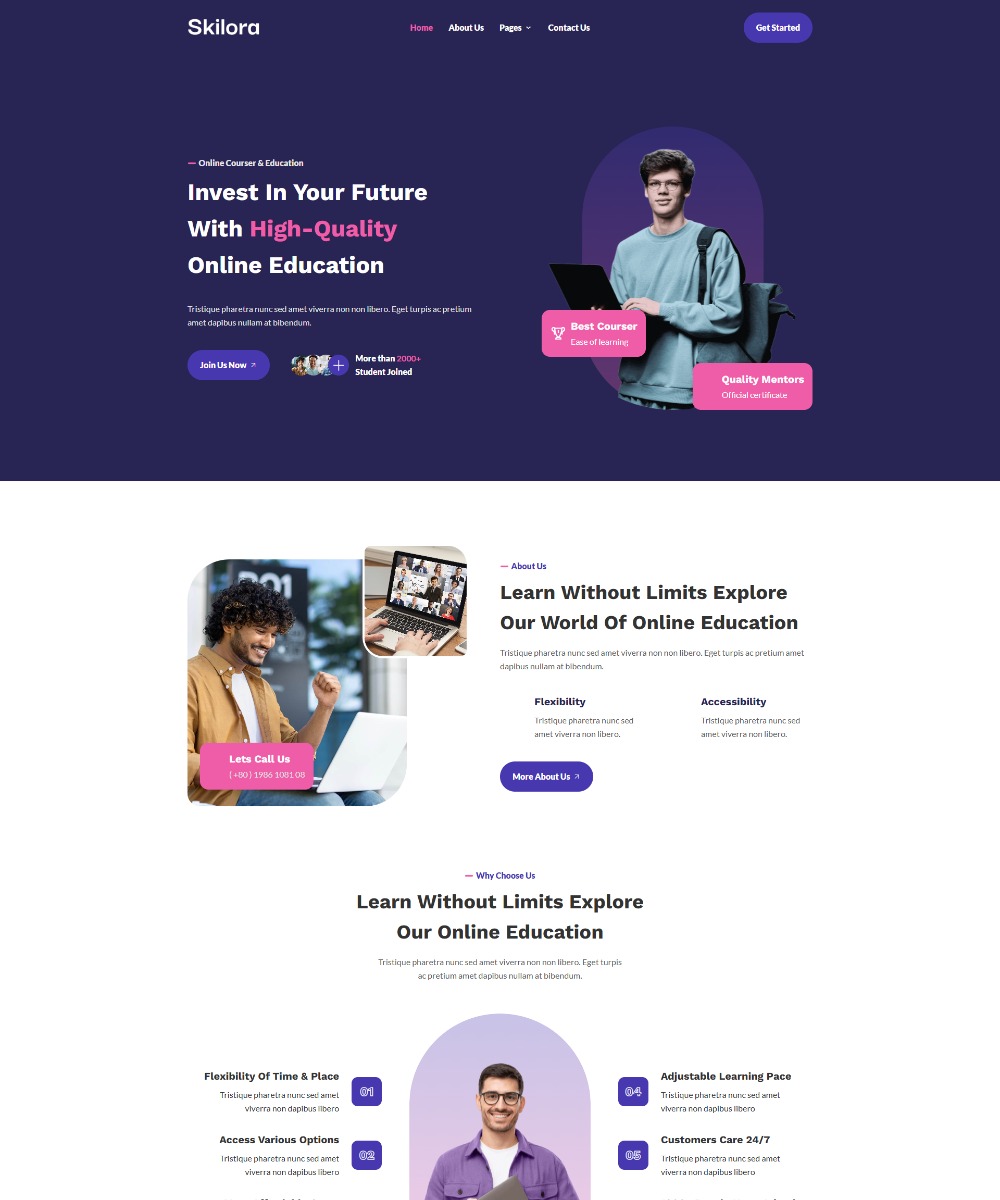 Skilora is a modern and flexible online course and education Elementor template built with Elementor for educators, trainers, and learning platforms. This template offers clean layouts and intuitive design to help you showcase courses, instructors, and educational content in a professional way. Skilora includes customizable sections for featured classes, testimonials, and pricing plans, making it easy to attract and engage students. With responsive design and seamless navigation, this template ensures a great user experience on both desktop and mobile devices.