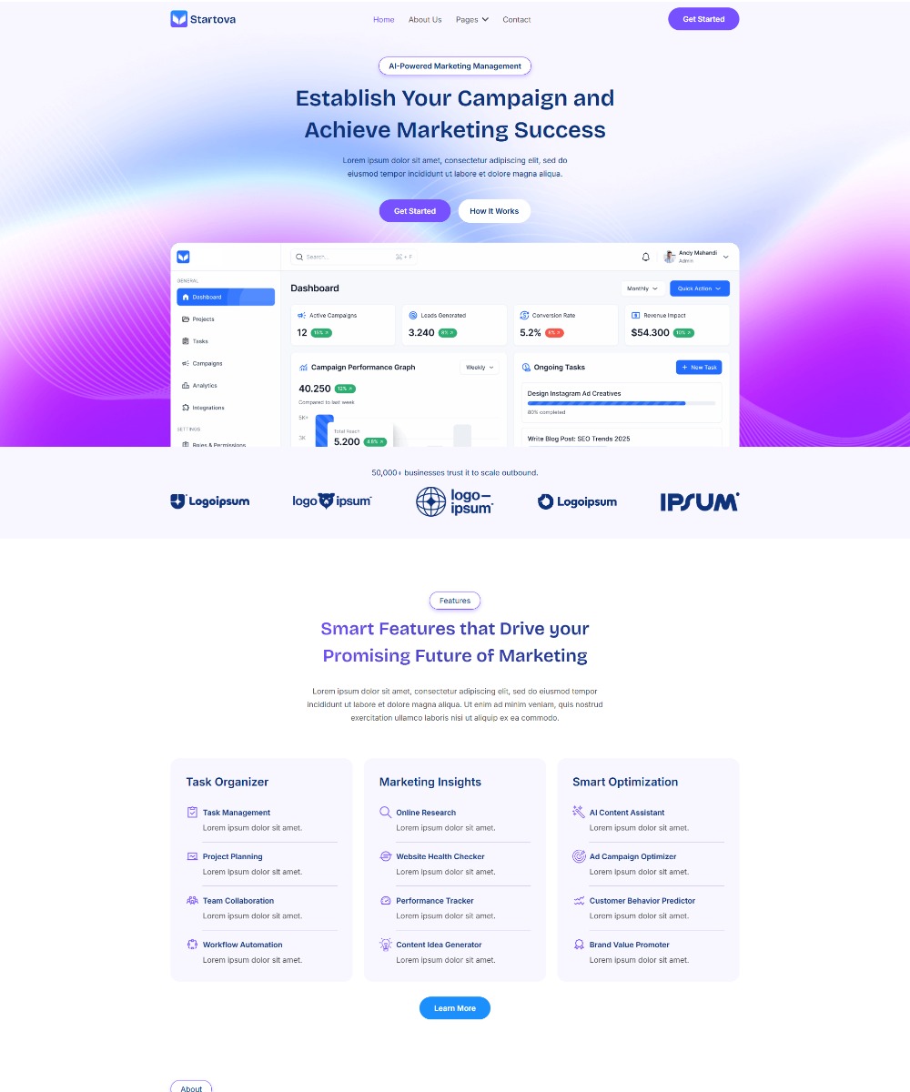 This template is fully responsive and easy to customize without coding, giving you the freedom to tailor content, colors, and styles to match your brand. With fast performance and SEO-friendly structure, Startova helps improve visibility in search results while delivering a great experience on all devices. Perfect for startups, tech companies, and SaaS businesses looking for a polished web presence.